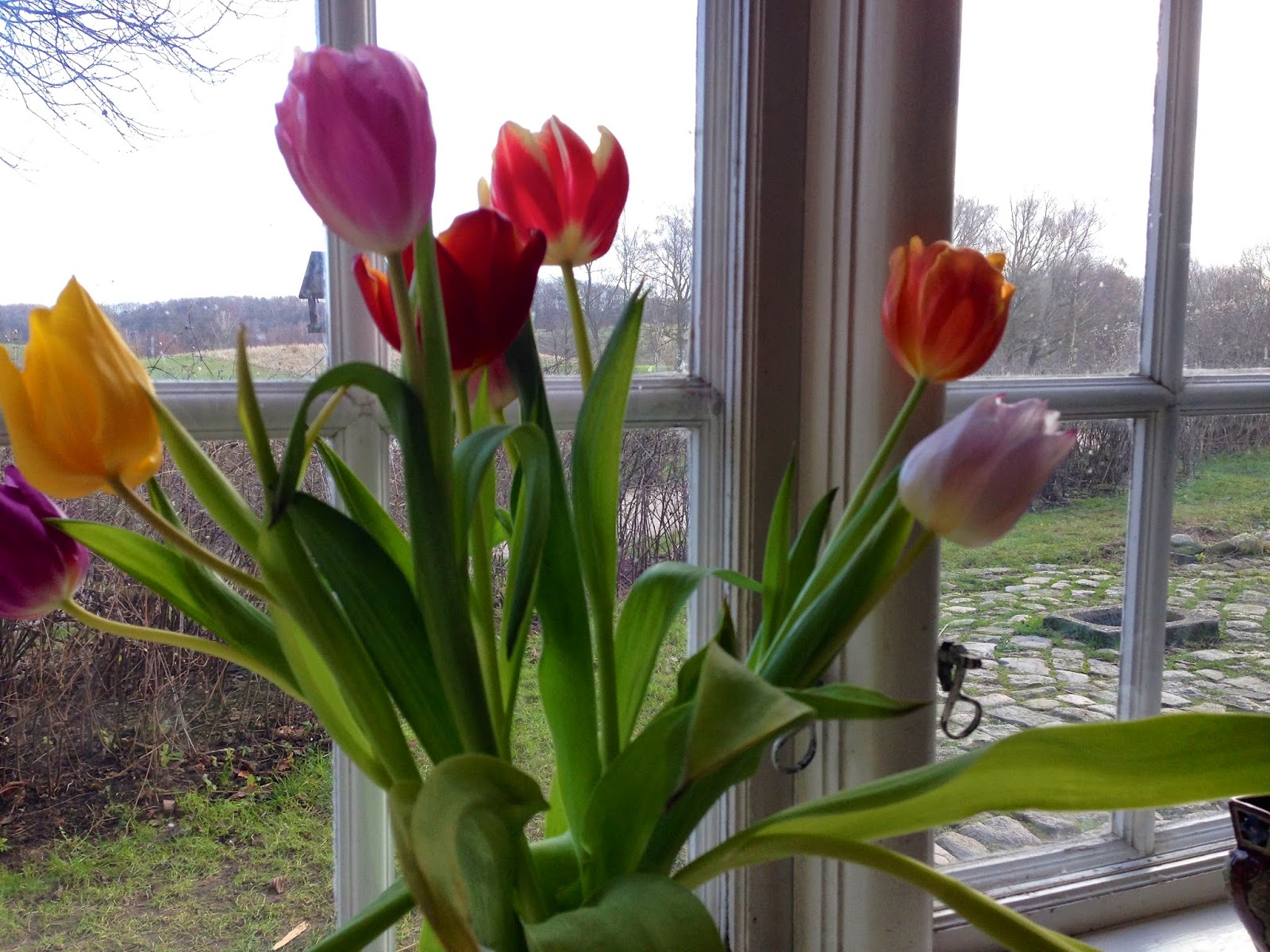 Tulipanerne fra nyårsfesten blev sat i vinduet.