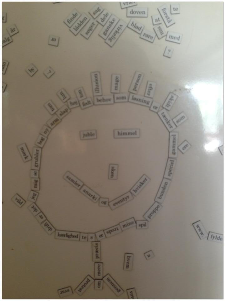 Nede under puden ligger gamle krøllede Grundtvig og kluk ler/ uden god grund/ det havde vi ikke talt om længe/det at stå fast/så du lå/ under puden/forpustet/forankret/frimodig og lo/ det blive værre i morgen/sagde du/og landet stod i våde/dit være smuldrede ned i mudderet under moderne sko/trampende sine nye sange og paroler/friheden: kluklo du/ befinder sig vel/uden/